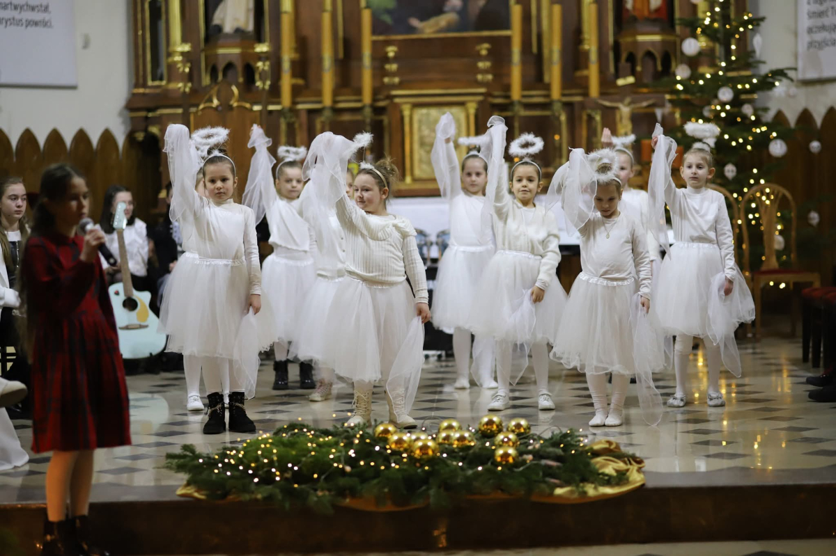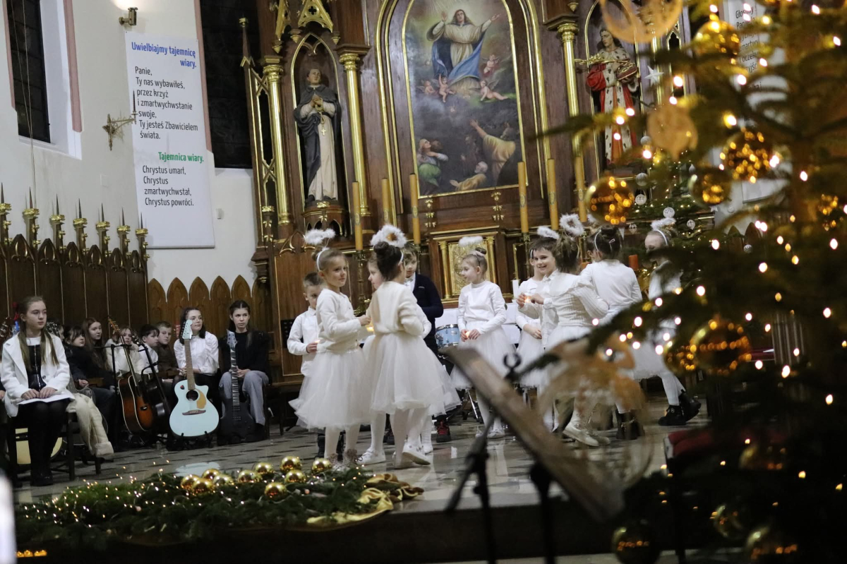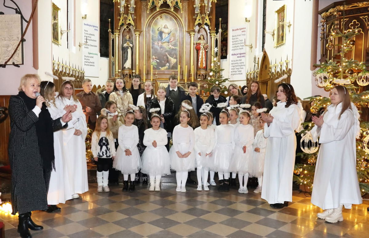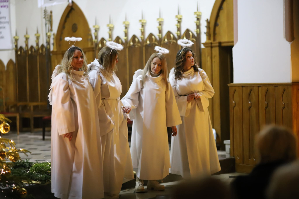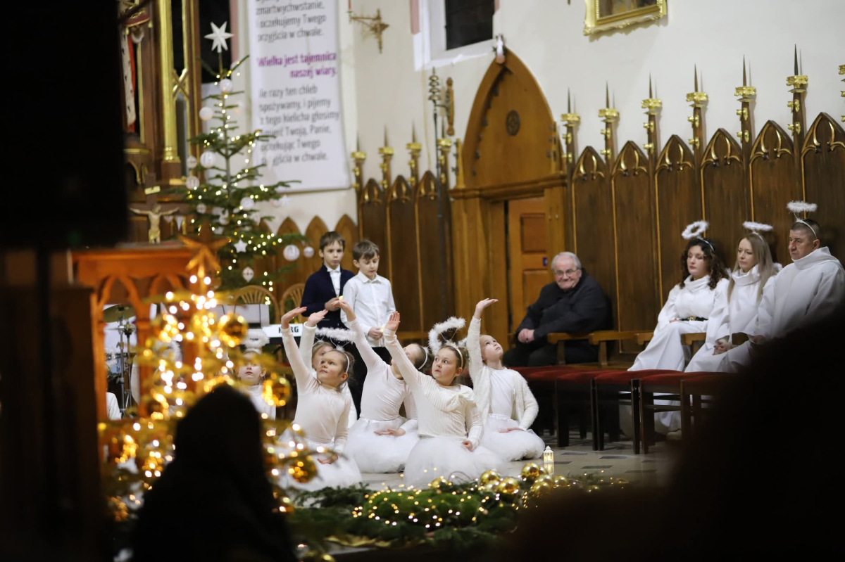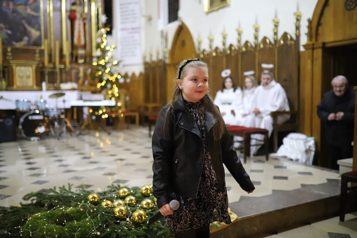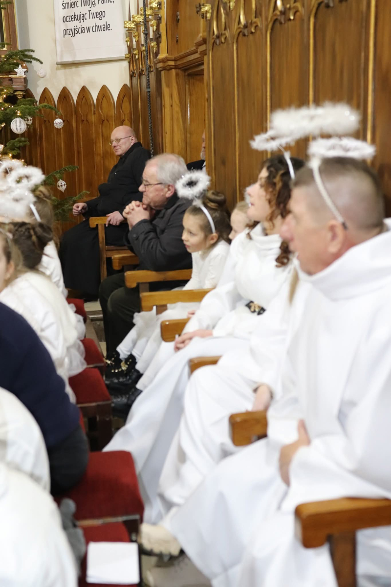 Panie Jezu, po raz czwarty przybyliśmy powitać Cię na świecie i śpiewać Twoją chwałę w kościele pw. Wniebowzięcia Najświętszej Marii Panny. Nieco spóźnieni i z lekką zadyszką (nawiązujemy do liryku ks. Kazimierza Wójtowicza), ale z przepełnionym radością sercem. Nie obyło się jednak bez komplikacji… Chodzi mianowicie o wielkie zamieszanie w niebie i na ziemi. Kiedy anielice szykowały wigilię, męska część nieba nie dopilnowała swoich obowiązków. Mała uboga dziewczynka z zapałkami marzła na mrozie. Znikąd nie było pomocy. Ludzie mijali ją obojętni. Co robić? Co robić? Martwiły się cherubiny. Jest remedium na ten kłopot! Tylko kolędy rozgrzeją ludzkie serca i skłonią ziemian do pomocy. Takie będzie rozwiązanie niebiańskiego kłopotu. Ale anioły przeliczyły swoje siły i potrzebowały natychmiastowej pomocy. To zadanie w sam raz dla nas! W sukurs przyszły i dzieci, i młodzież. Co nastąpiło potem? Próżno by opowiadać. Na własne oczy trzeba by to zobaczyć oraz usłyszeć. Dźwięczne śpiewne głosy, brzmienie gitar, mocne uderzenie zespołu muzycznego i anielskie pląsy rozgrzewały nieczułe ludzkie serca. Z pomocą pośpieszyli również dorośli: nasze Seniorki, zespół „Pacanowianie”, zespół „Singers QR” z Rytwian oraz rodzima „Oleśniczanka”. Było radośnie i dla ucha bardzo bardzo przyjemnie…