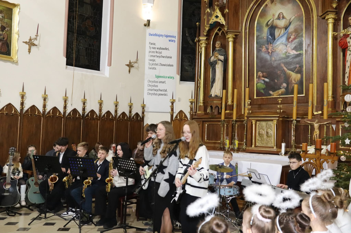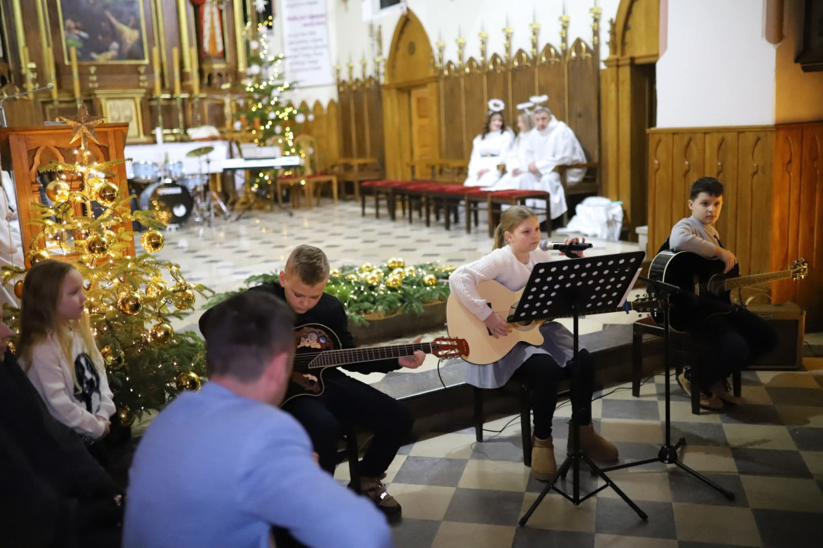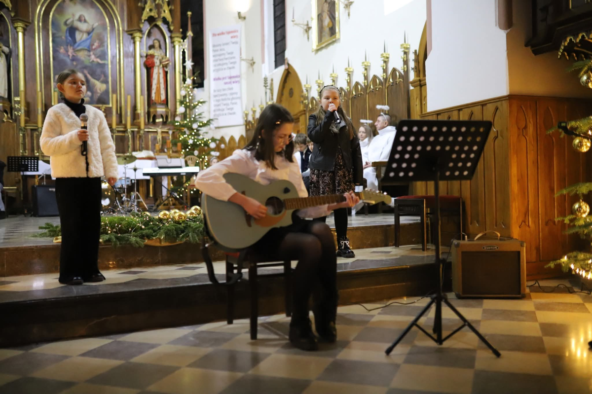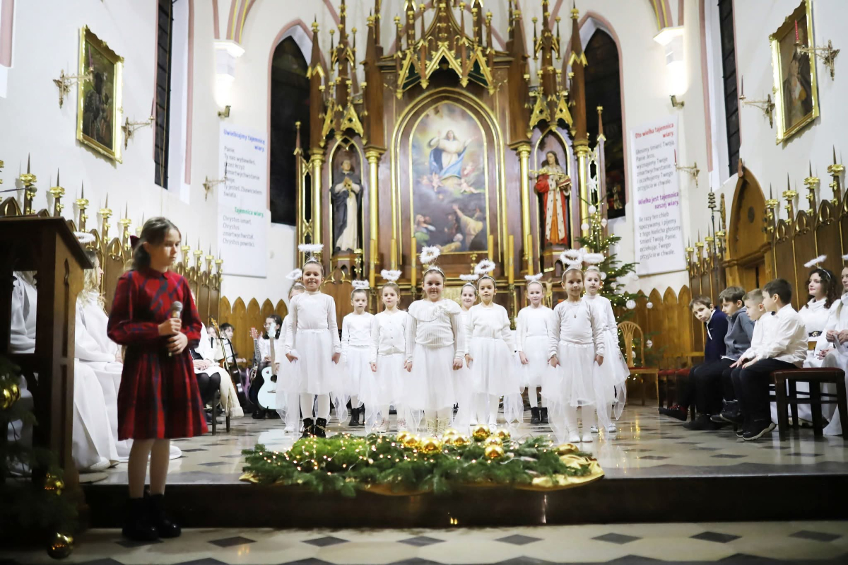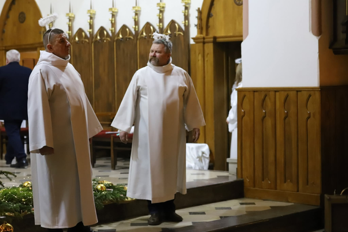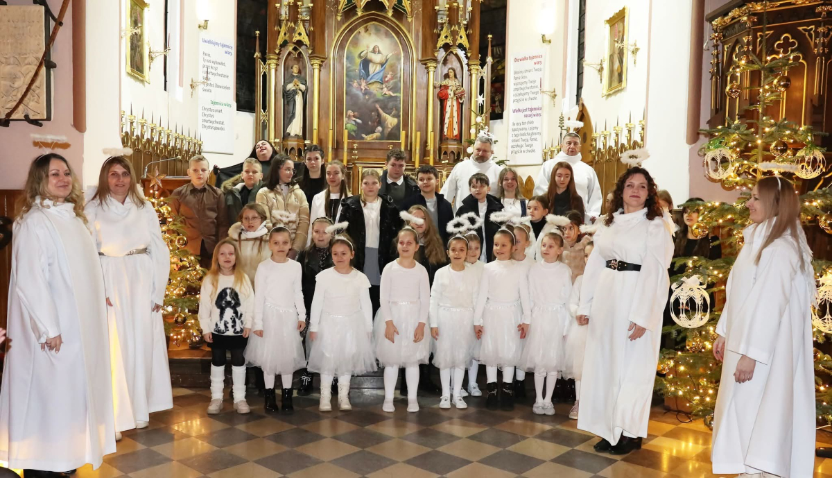 Panie Jezu, po raz czwarty przybyliśmy powitać Cię na świecie i śpiewać Twoją chwałę w kościele pw. Wniebowzięcia Najświętszej Marii Panny. Nieco spóźnieni i z lekką zadyszką (nawiązujemy do liryku ks. Kazimierza Wójtowicza), ale z przepełnionym radością sercem. Nie obyło się jednak bez komplikacji… Chodzi mianowicie o wielkie zamieszanie w niebie i na ziemi. Kiedy anielice szykowały wigilię, męska część nieba nie dopilnowała swoich obowiązków. Mała uboga dziewczynka z zapałkami marzła na mrozie. Znikąd nie było pomocy. Ludzie mijali ją obojętni. Co robić? Co robić? Martwiły się cherubiny. Jest remedium na ten kłopot! Tylko kolędy rozgrzeją ludzkie serca i skłonią ziemian do pomocy. Takie będzie rozwiązanie niebiańskiego kłopotu. Ale anioły przeliczyły swoje siły i potrzebowały natychmiastowej pomocy. To zadanie w sam raz dla nas! W sukurs przyszły i dzieci, i młodzież. Co nastąpiło potem? Próżno by opowiadać. Na własne oczy trzeba by to zobaczyć oraz usłyszeć. Dźwięczne śpiewne głosy, brzmienie gitar, mocne uderzenie zespołu muzycznego i anielskie pląsy rozgrzewały nieczułe ludzkie serca. Z pomocą pośpieszyli również dorośli: nasze Seniorki, zespół „Pacanowianie”, zespół „Singers QR” z Rytwian oraz rodzima „Oleśniczanka”. Było radośnie i dla ucha bardzo bardzo przyjemnie…