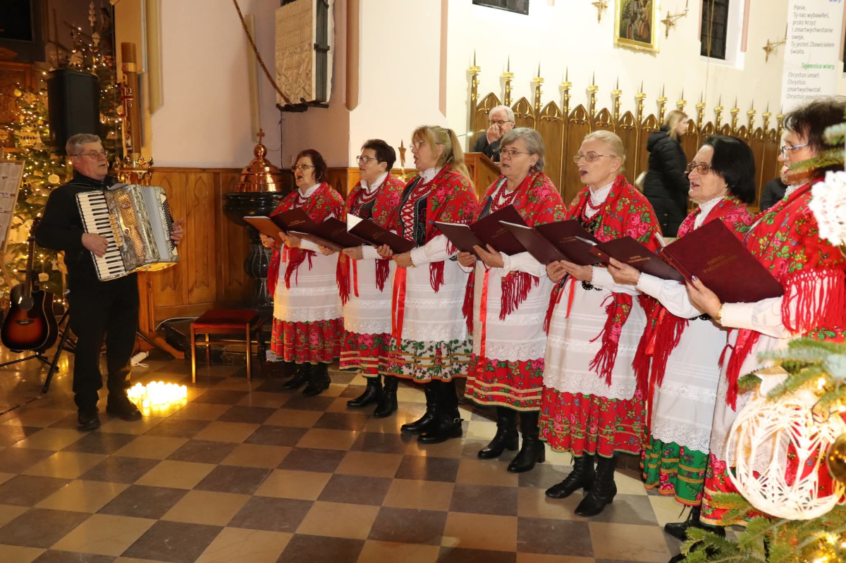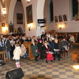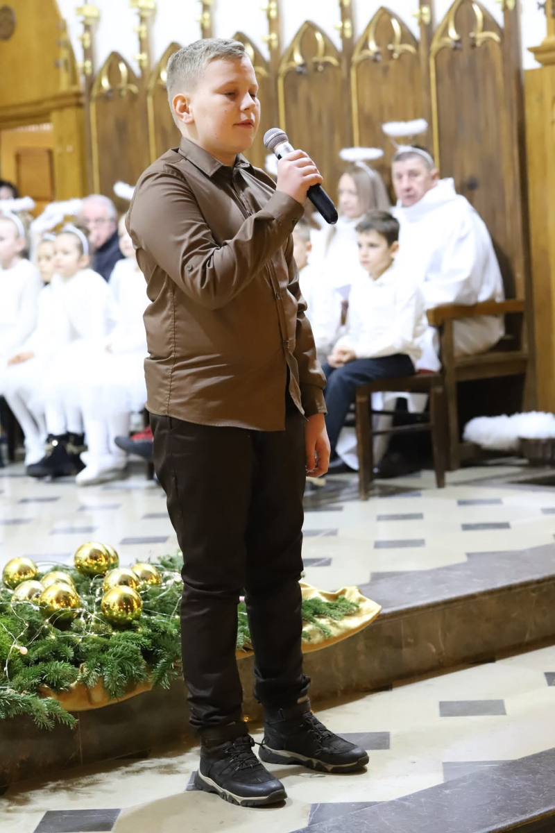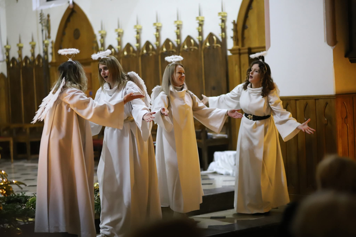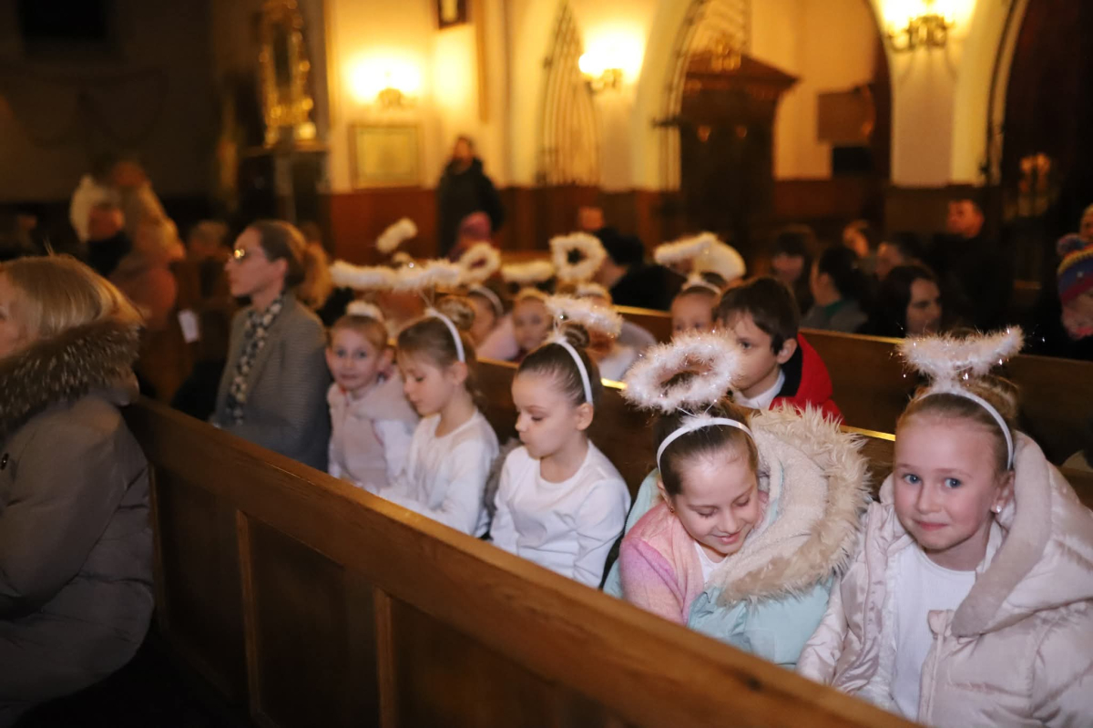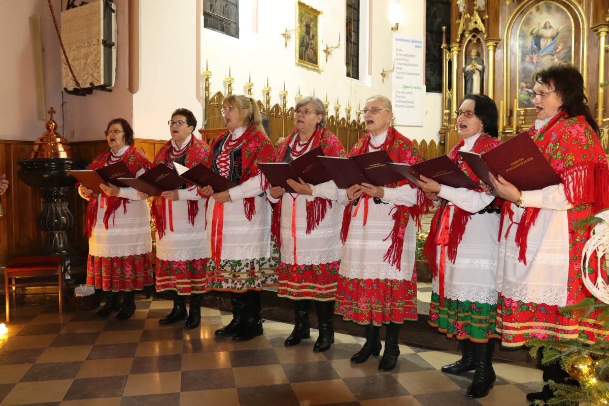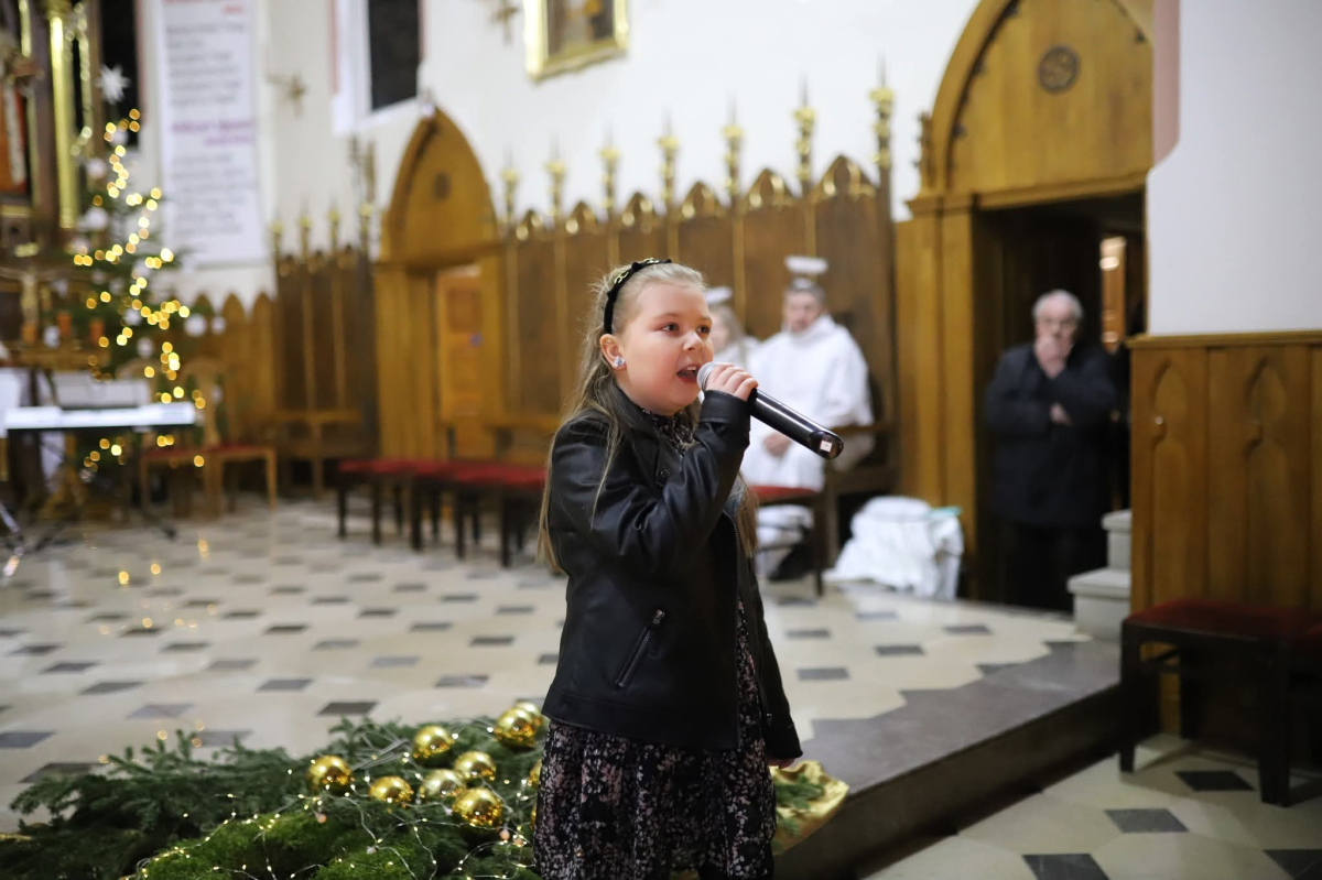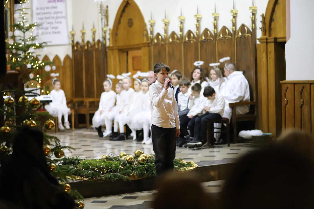 Panie Jezu, po raz czwarty przybyliśmy powitać Cię na świecie i śpiewać Twoją chwałę w kościele pw. Wniebowzięcia Najświętszej Marii Panny. Nieco spóźnieni i z lekką zadyszką (nawiązujemy do liryku ks. Kazimierza Wójtowicza), ale z przepełnionym radością sercem. Nie obyło się jednak bez komplikacji… Chodzi mianowicie o wielkie zamieszanie w niebie i na ziemi. Kiedy anielice szykowały wigilię, męska część nieba nie dopilnowała swoich obowiązków. Mała uboga dziewczynka z zapałkami marzła na mrozie. Znikąd nie było pomocy. Ludzie mijali ją obojętni. Co robić? Co robić? Martwiły się cherubiny. Jest remedium na ten kłopot! Tylko kolędy rozgrzeją ludzkie serca i skłonią ziemian do pomocy. Takie będzie rozwiązanie niebiańskiego kłopotu. Ale anioły przeliczyły swoje siły i potrzebowały natychmiastowej pomocy. To zadanie w sam raz dla nas! W sukurs przyszły i dzieci, i młodzież. Co nastąpiło potem? Próżno by opowiadać. Na własne oczy trzeba by to zobaczyć oraz usłyszeć. Dźwięczne śpiewne głosy, brzmienie gitar, mocne uderzenie zespołu muzycznego i anielskie pląsy rozgrzewały nieczułe ludzkie serca. Z pomocą pośpieszyli również dorośli: nasze Seniorki, zespół „Pacanowianie”, zespół „Singers QR” z Rytwian oraz rodzima „Oleśniczanka”. Było radośnie i dla ucha bardzo bardzo przyjemnie…