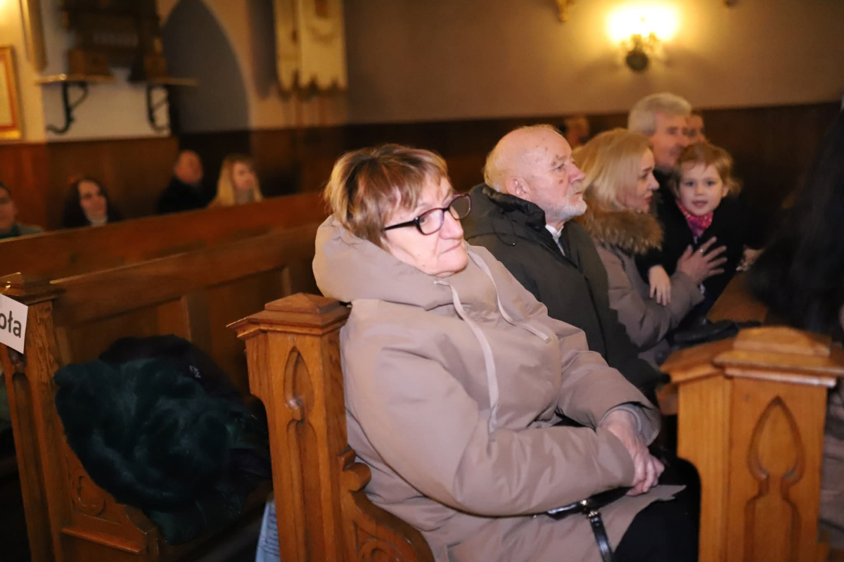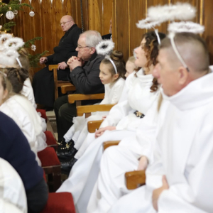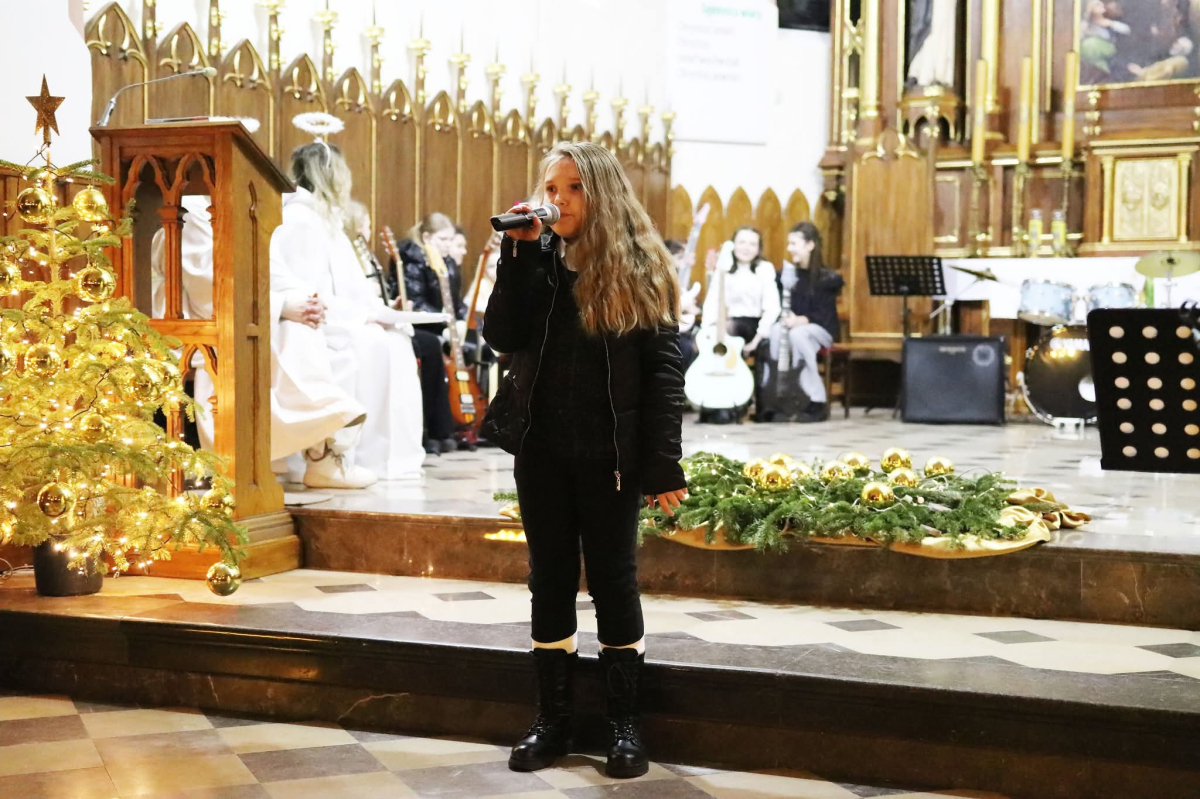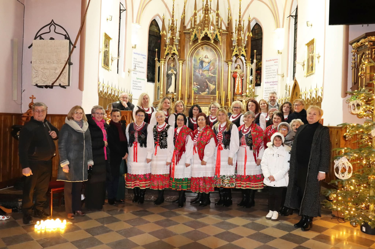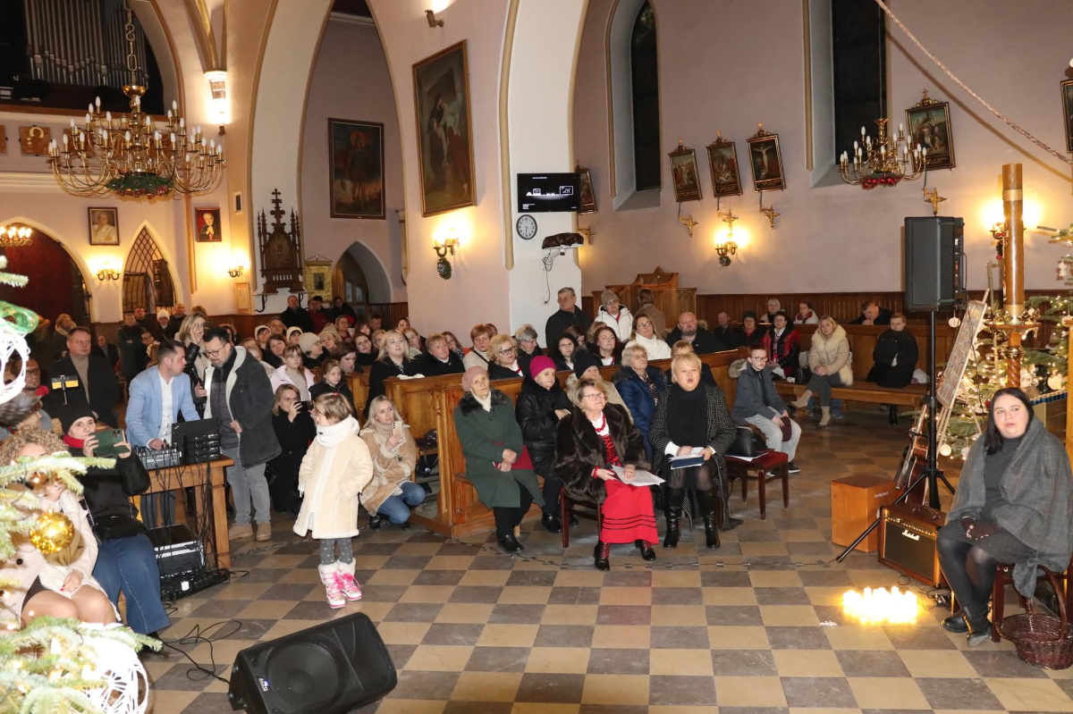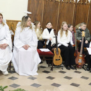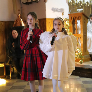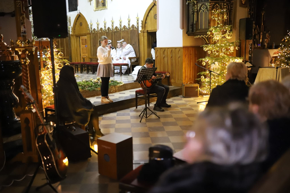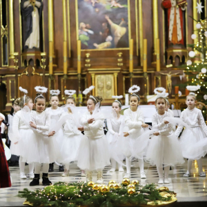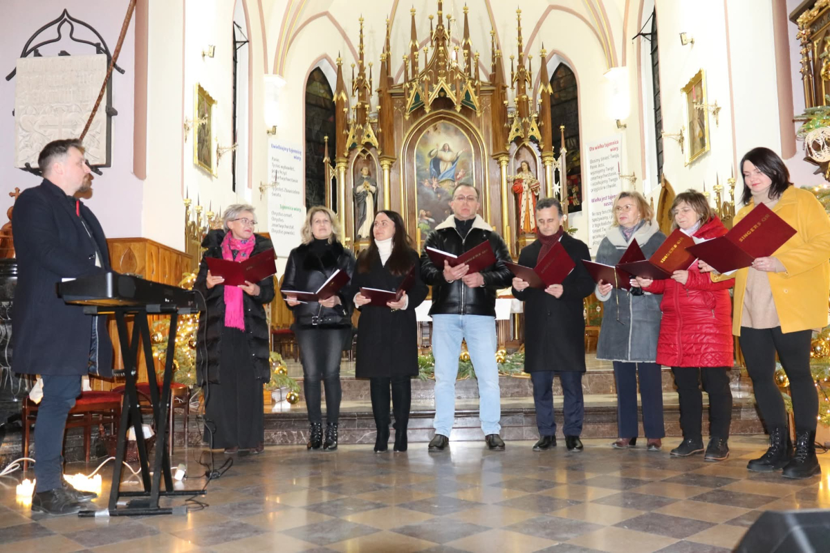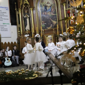 Panie Jezu, po raz czwarty przybyliśmy powitać Cię na świecie i śpiewać Twoją chwałę w kościele pw. Wniebowzięcia Najświętszej Marii Panny. Nieco spóźnieni i z lekką zadyszką (nawiązujemy do liryku ks. Kazimierza Wójtowicza), ale z przepełnionym radością sercem. Nie obyło się jednak bez komplikacji… Chodzi mianowicie o wielkie zamieszanie w niebie i na ziemi. Kiedy anielice szykowały wigilię, męska część nieba nie dopilnowała swoich obowiązków. Mała uboga dziewczynka z zapałkami marzła na mrozie. Znikąd nie było pomocy. Ludzie mijali ją obojętni. Co robić? Co robić? Martwiły się cherubiny. Jest remedium na ten kłopot! Tylko kolędy rozgrzeją ludzkie serca i skłonią ziemian do pomocy. Takie będzie rozwiązanie niebiańskiego kłopotu. Ale anioły przeliczyły swoje siły i potrzebowały natychmiastowej pomocy. To zadanie w sam raz dla nas! W sukurs przyszły i dzieci, i młodzież. Co nastąpiło potem? Próżno by opowiadać. Na własne oczy trzeba by to zobaczyć oraz usłyszeć. Dźwięczne śpiewne głosy, brzmienie gitar, mocne uderzenie zespołu muzycznego i anielskie pląsy rozgrzewały nieczułe ludzkie serca. Z pomocą pośpieszyli również dorośli: nasze Seniorki, zespół „Pacanowianie”, zespół „Singers QR” z Rytwian oraz rodzima „Oleśniczanka”. Było radośnie i dla ucha bardzo bardzo przyjemnie…