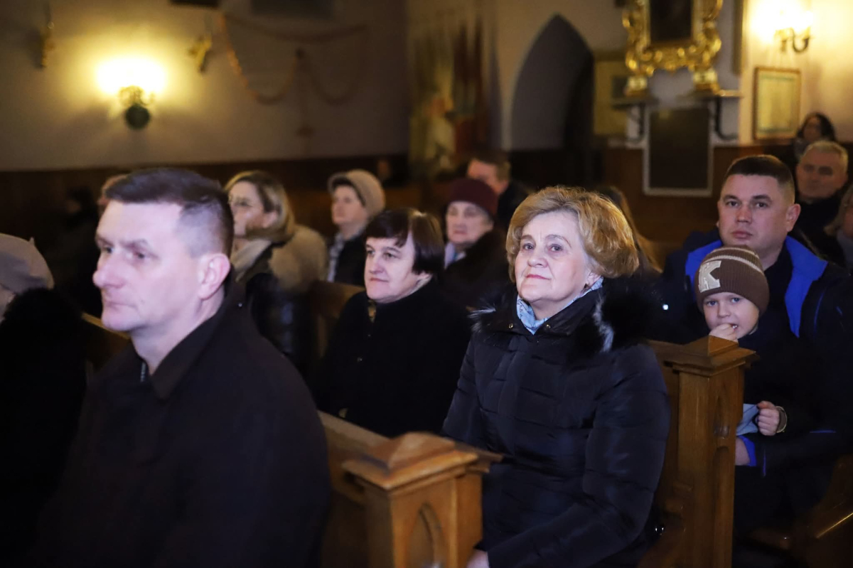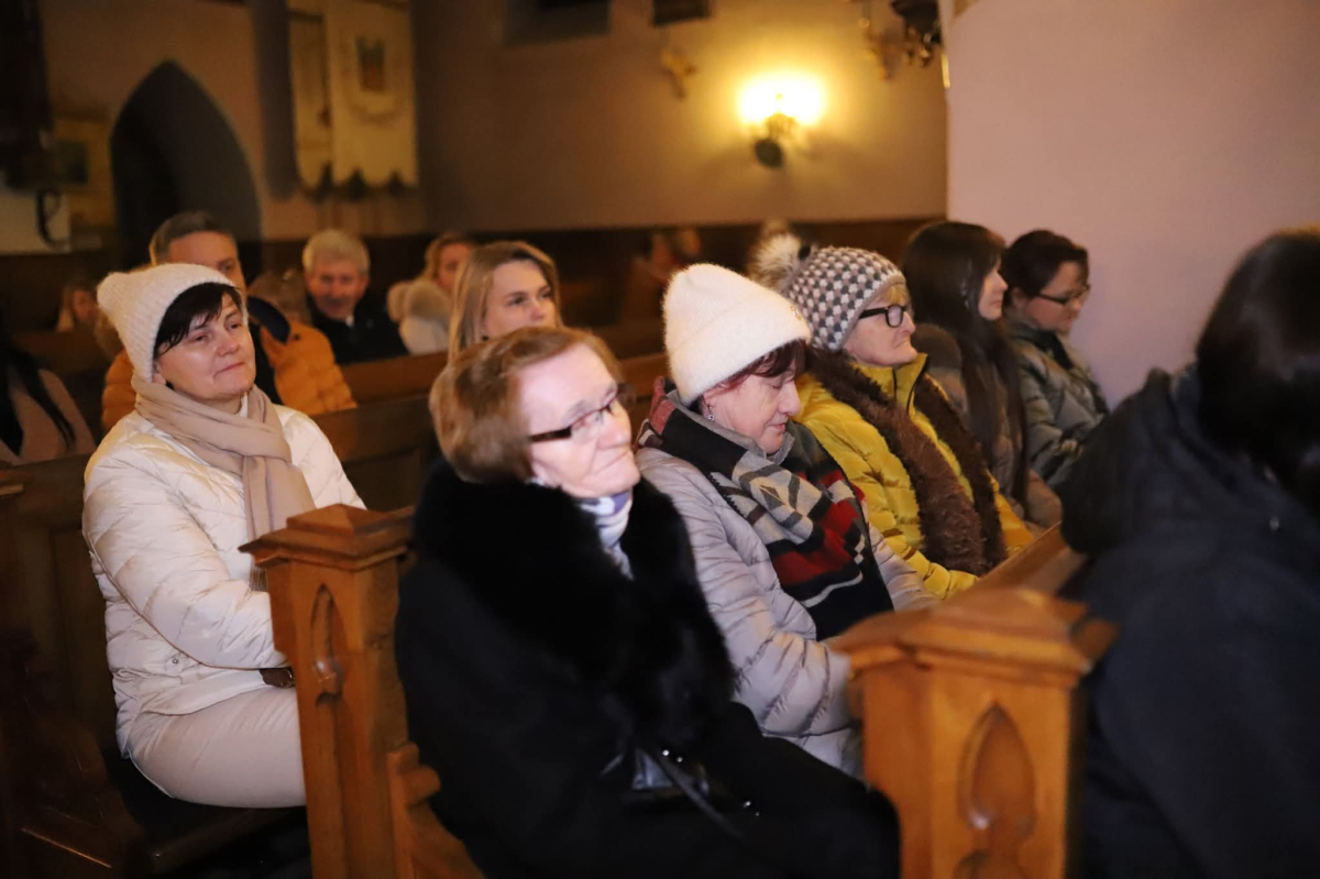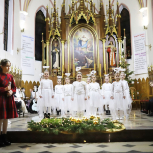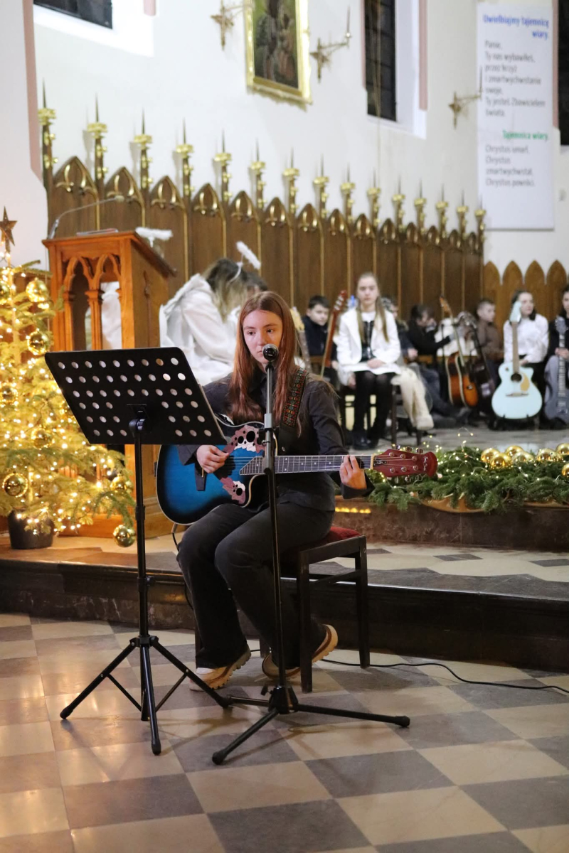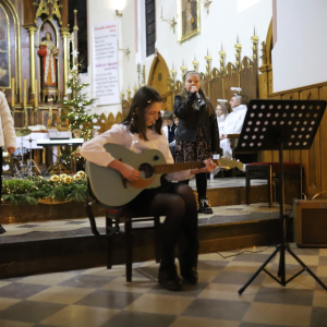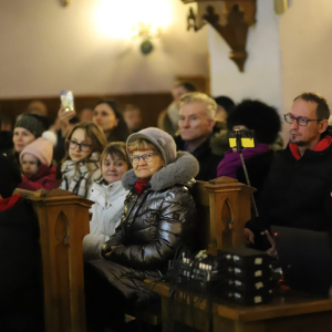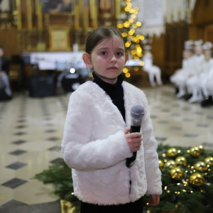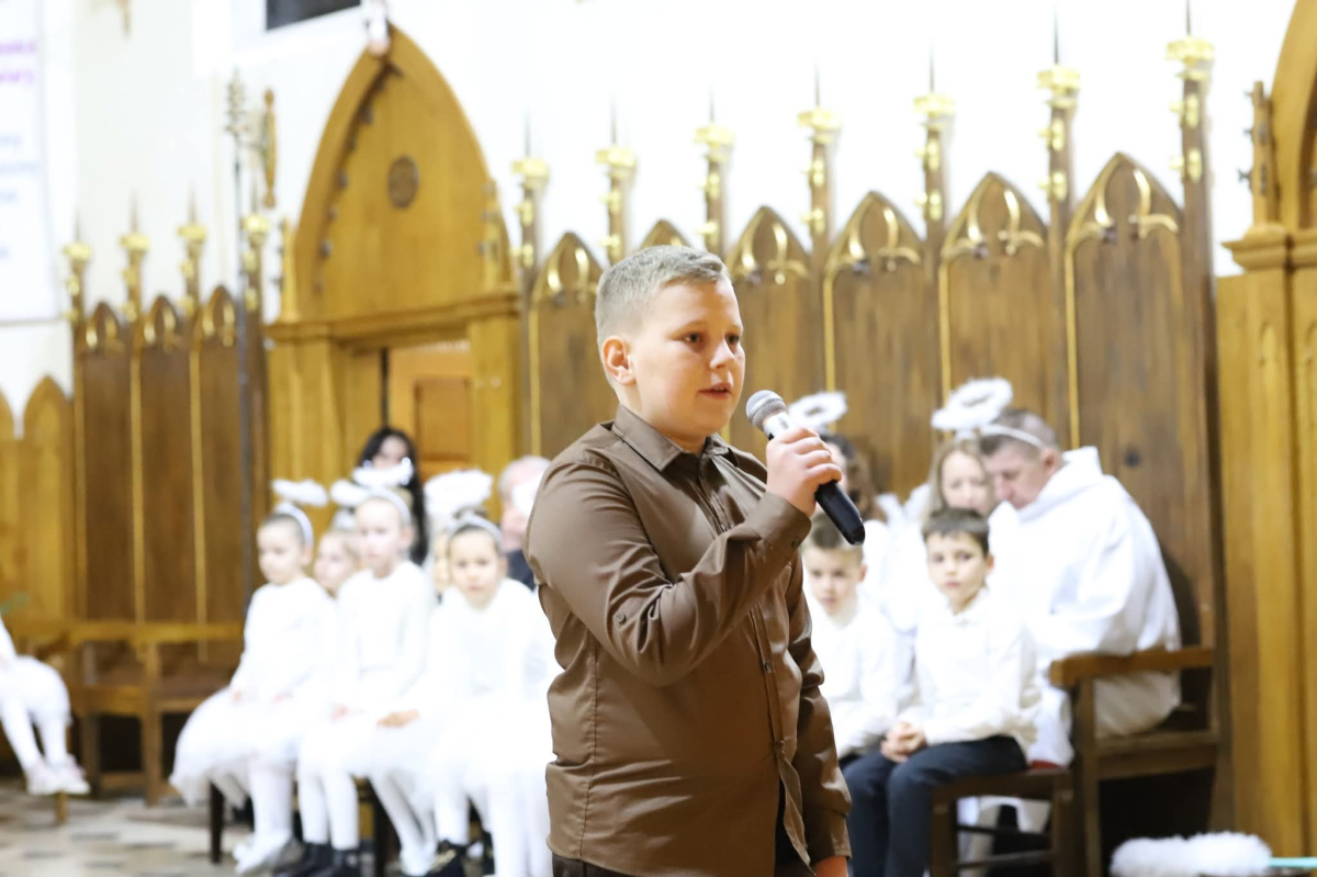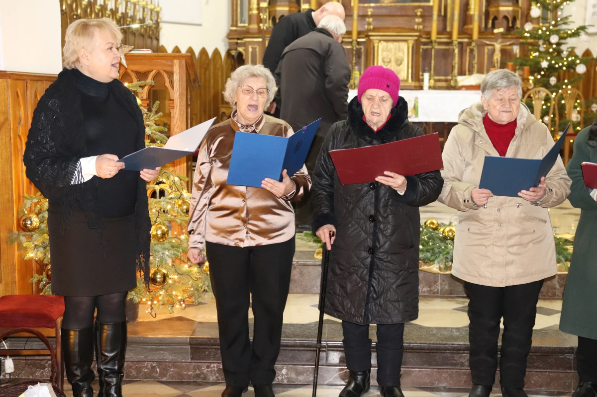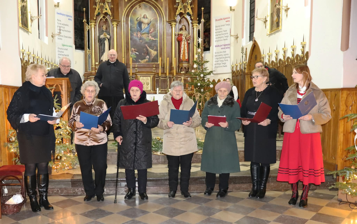 Panie Jezu, po raz czwarty przybyliśmy powitać Cię na świecie i śpiewać Twoją chwałę w kościele pw. Wniebowzięcia Najświętszej Marii Panny. Nieco spóźnieni i z lekką zadyszką (nawiązujemy do liryku ks. Kazimierza Wójtowicza), ale z przepełnionym radością sercem. Nie obyło się jednak bez komplikacji… Chodzi mianowicie o wielkie zamieszanie w niebie i na ziemi. Kiedy anielice szykowały wigilię, męska część nieba nie dopilnowała swoich obowiązków. Mała uboga dziewczynka z zapałkami marzła na mrozie. Znikąd nie było pomocy. Ludzie mijali ją obojętni. Co robić? Co robić? Martwiły się cherubiny. Jest remedium na ten kłopot! Tylko kolędy rozgrzeją ludzkie serca i skłonią ziemian do pomocy. Takie będzie rozwiązanie niebiańskiego kłopotu. Ale anioły przeliczyły swoje siły i potrzebowały natychmiastowej pomocy. To zadanie w sam raz dla nas! W sukurs przyszły i dzieci, i młodzież. Co nastąpiło potem? Próżno by opowiadać. Na własne oczy trzeba by to zobaczyć oraz usłyszeć. Dźwięczne śpiewne głosy, brzmienie gitar, mocne uderzenie zespołu muzycznego i anielskie pląsy rozgrzewały nieczułe ludzkie serca. Z pomocą pośpieszyli również dorośli: nasze Seniorki, zespół „Pacanowianie”, zespół „Singers QR” z Rytwian oraz rodzima „Oleśniczanka”. Było radośnie i dla ucha bardzo bardzo przyjemnie…