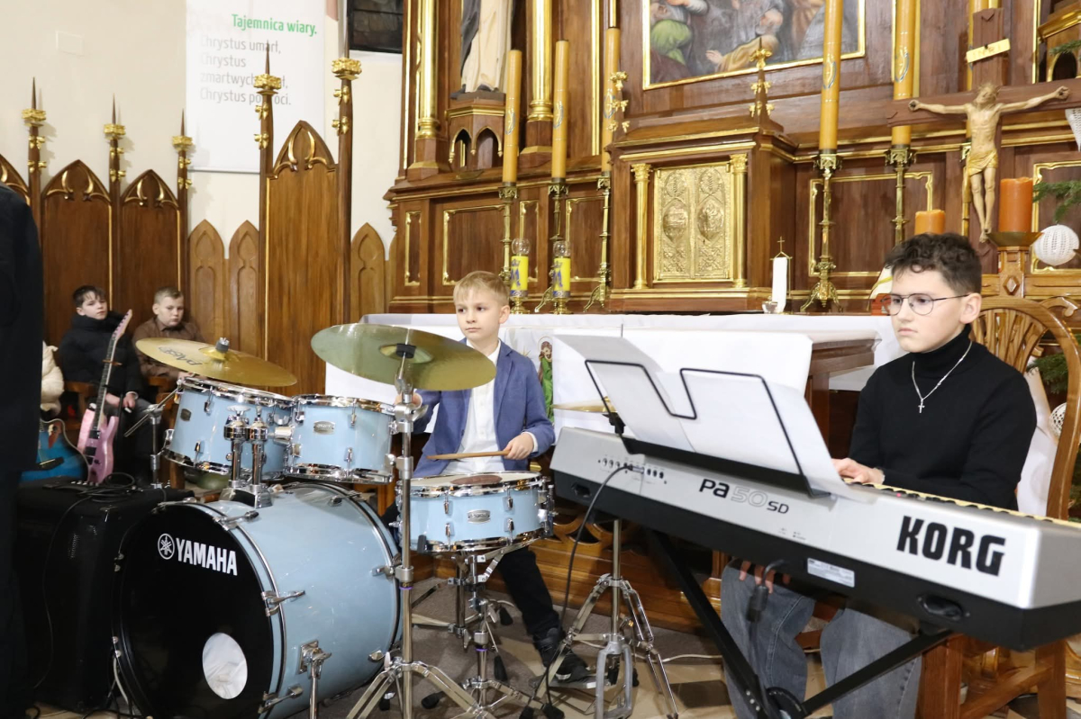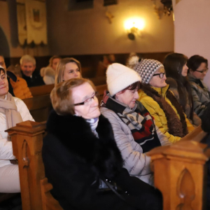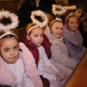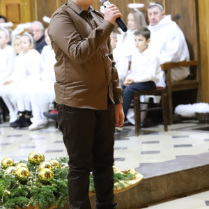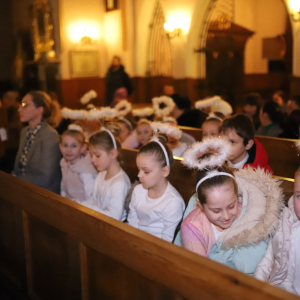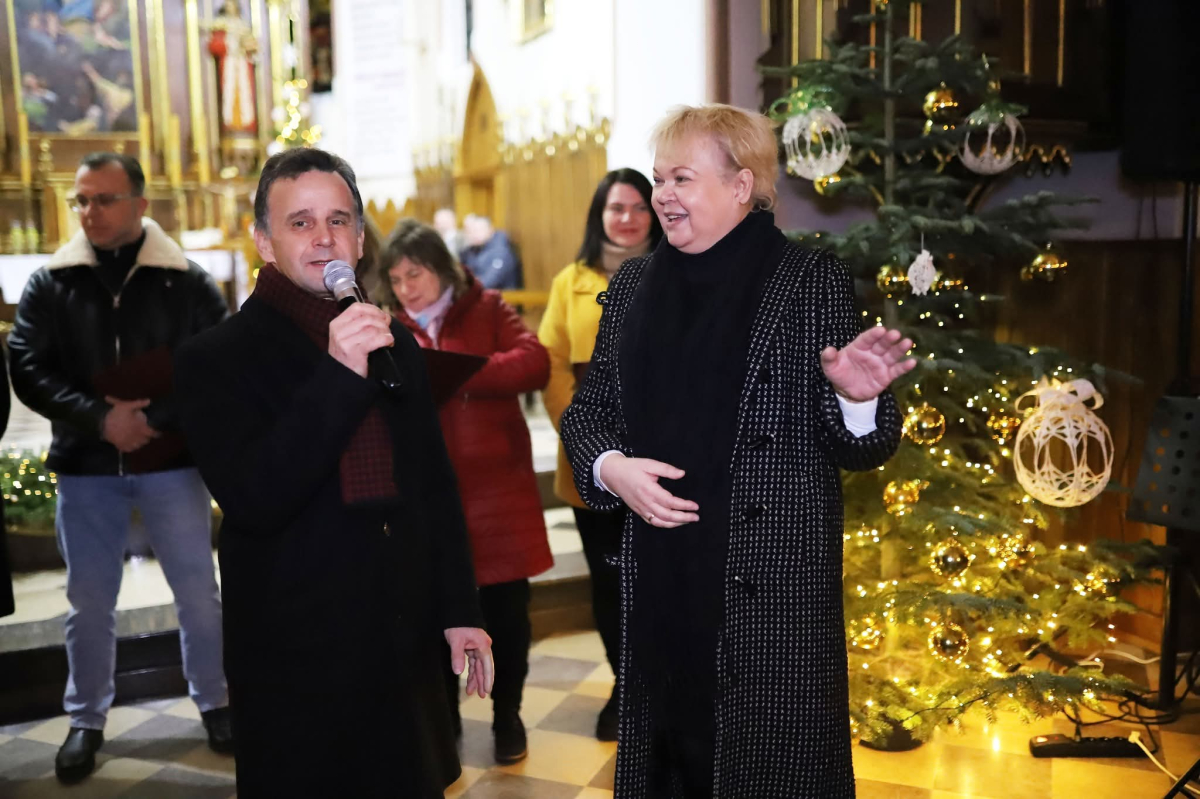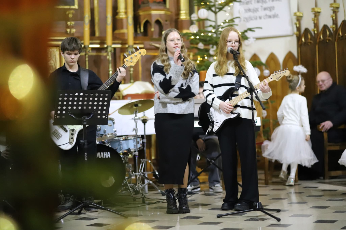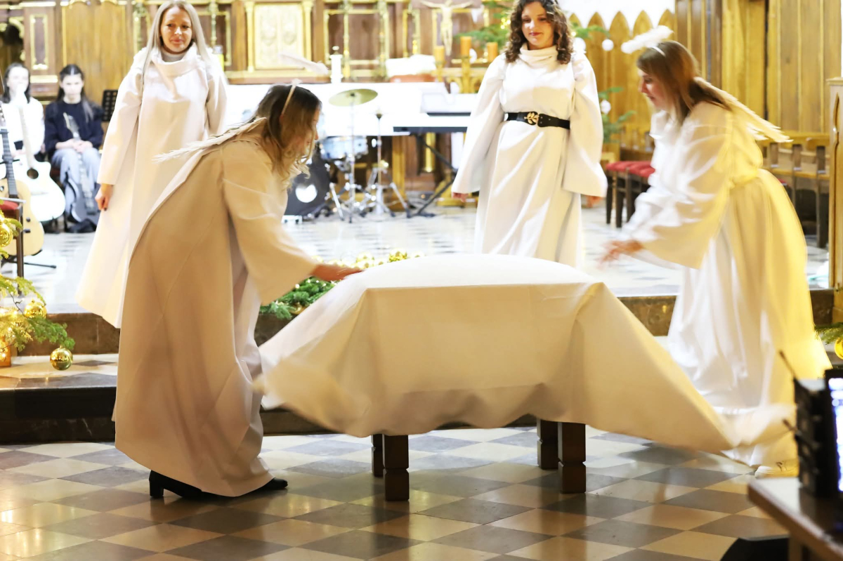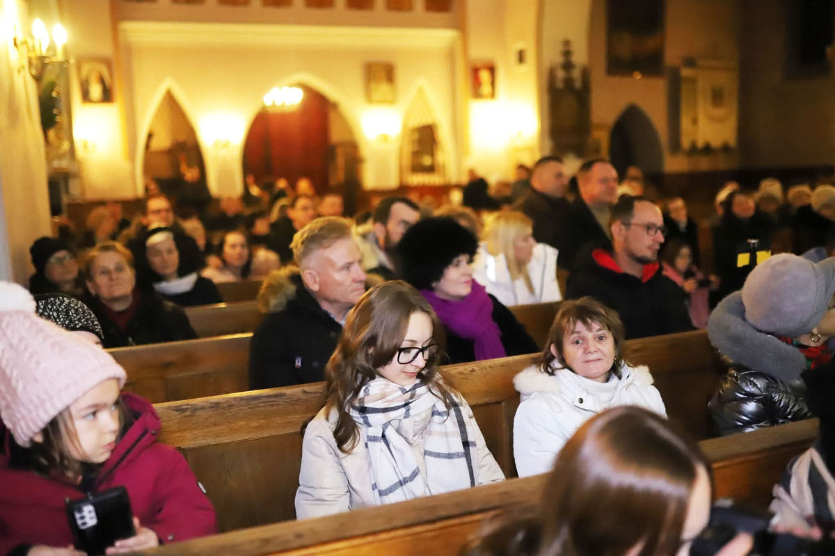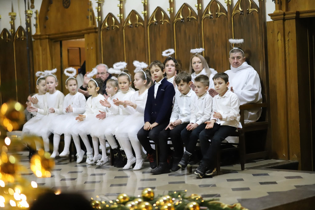 Panie Jezu, po raz czwarty przybyliśmy powitać Cię na świecie i śpiewać Twoją chwałę w kościele pw. Wniebowzięcia Najświętszej Marii Panny. Nieco spóźnieni i z lekką zadyszką (nawiązujemy do liryku ks. Kazimierza Wójtowicza), ale z przepełnionym radością sercem. Nie obyło się jednak bez komplikacji… Chodzi mianowicie o wielkie zamieszanie w niebie i na ziemi. Kiedy anielice szykowały wigilię, męska część nieba nie dopilnowała swoich obowiązków. Mała uboga dziewczynka z zapałkami marzła na mrozie. Znikąd nie było pomocy. Ludzie mijali ją obojętni. Co robić? Co robić? Martwiły się cherubiny. Jest remedium na ten kłopot! Tylko kolędy rozgrzeją ludzkie serca i skłonią ziemian do pomocy. Takie będzie rozwiązanie niebiańskiego kłopotu. Ale anioły przeliczyły swoje siły i potrzebowały natychmiastowej pomocy. To zadanie w sam raz dla nas! W sukurs przyszły i dzieci, i młodzież. Co nastąpiło potem? Próżno by opowiadać. Na własne oczy trzeba by to zobaczyć oraz usłyszeć. Dźwięczne śpiewne głosy, brzmienie gitar, mocne uderzenie zespołu muzycznego i anielskie pląsy rozgrzewały nieczułe ludzkie serca. Z pomocą pośpieszyli również dorośli: nasze Seniorki, zespół „Pacanowianie”, zespół „Singers QR” z Rytwian oraz rodzima „Oleśniczanka”. Było radośnie i dla ucha bardzo bardzo przyjemnie…