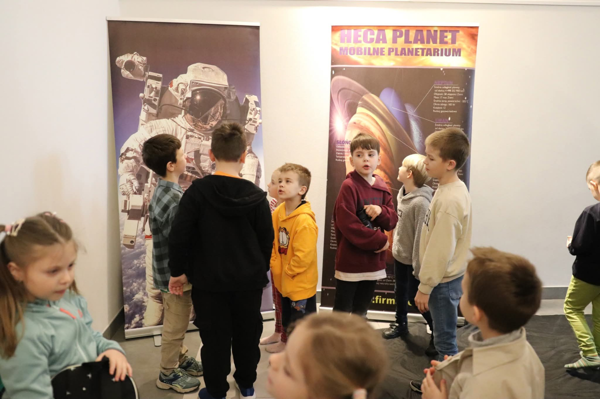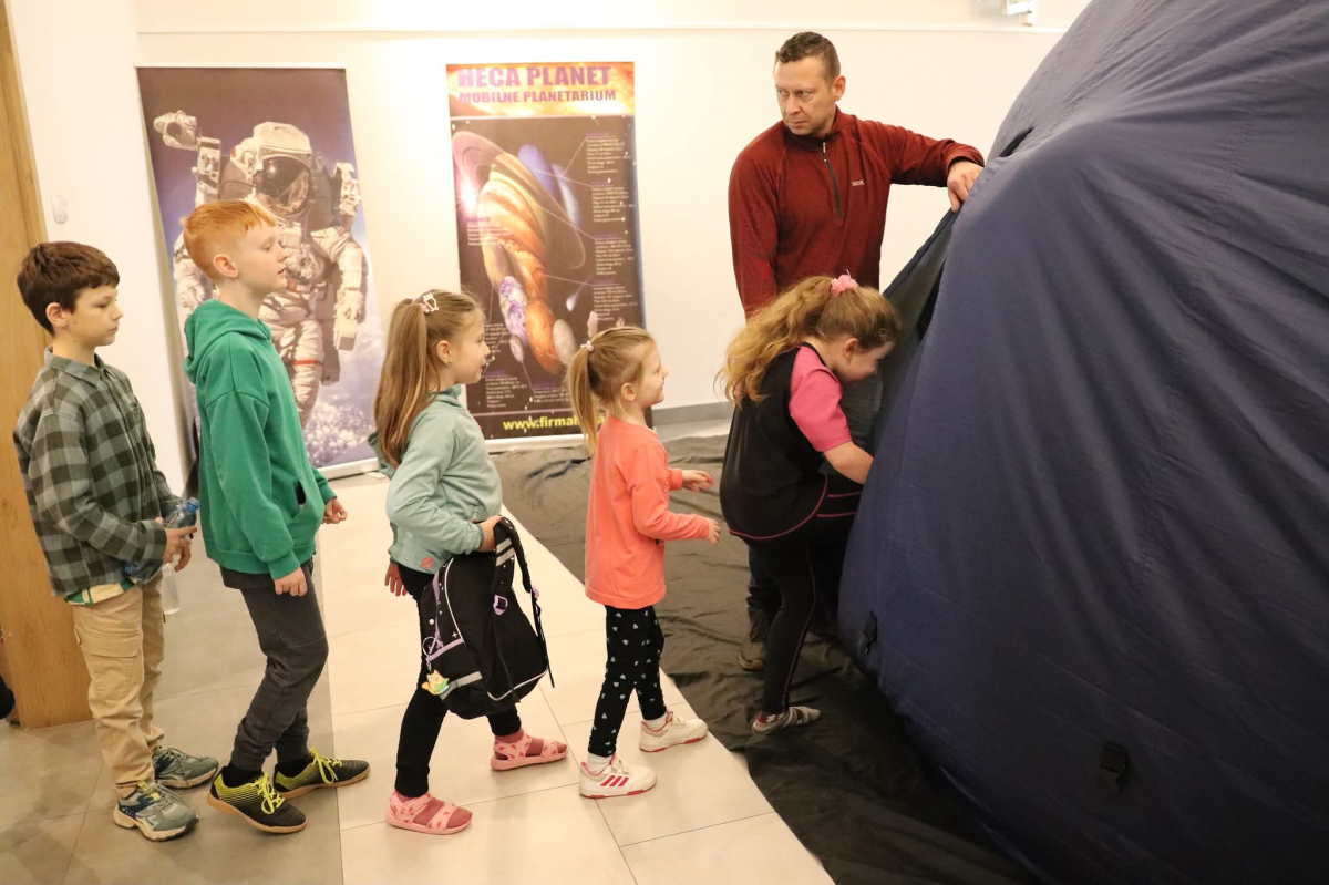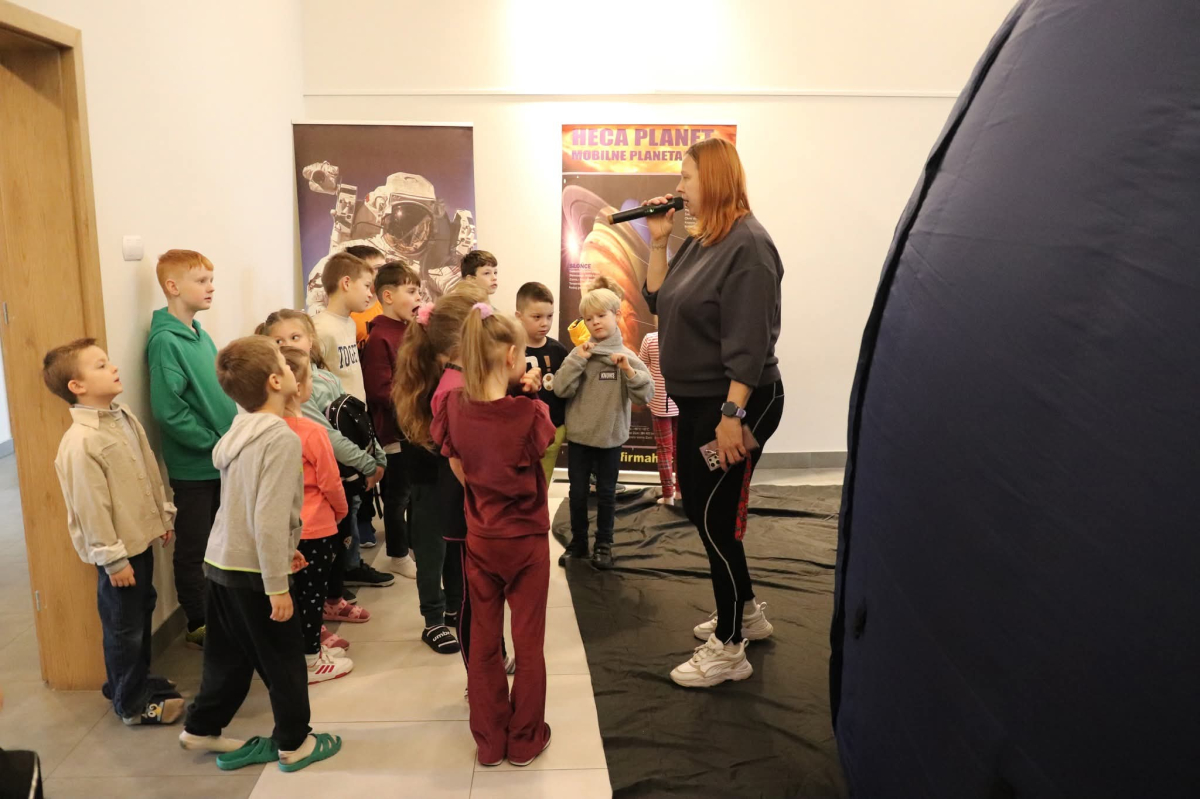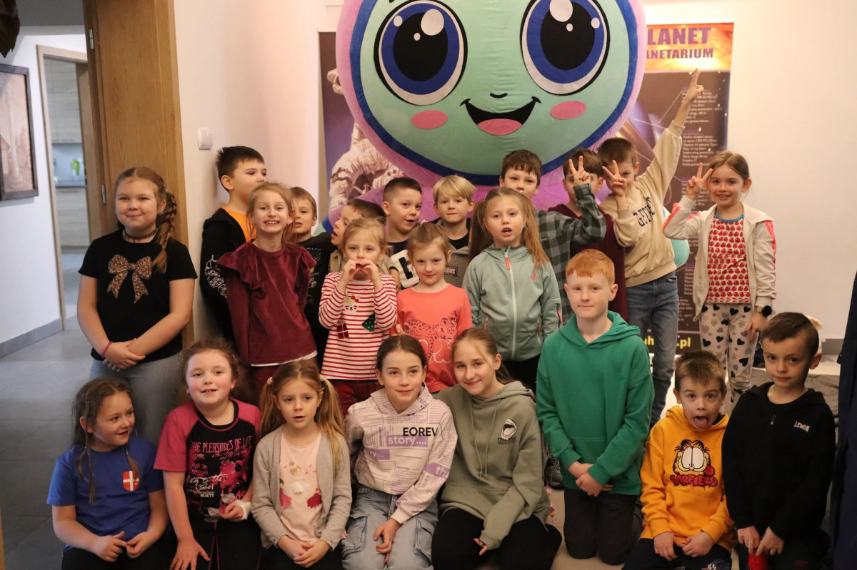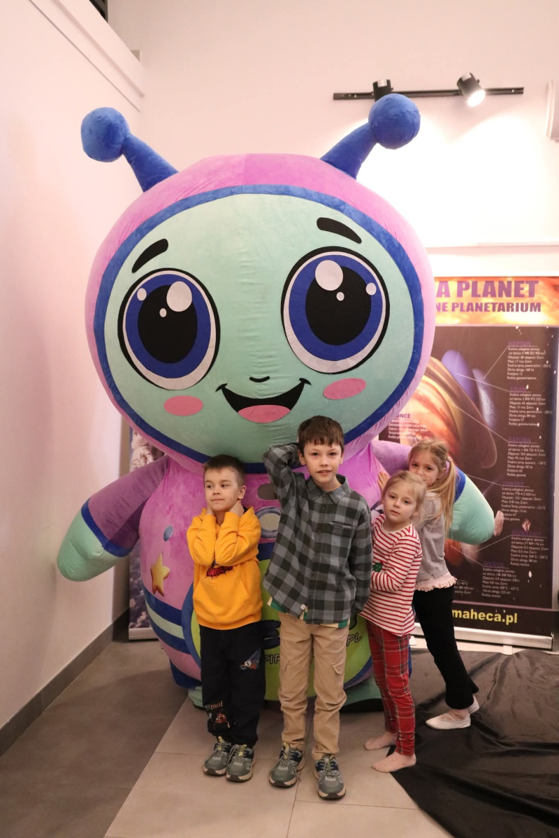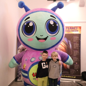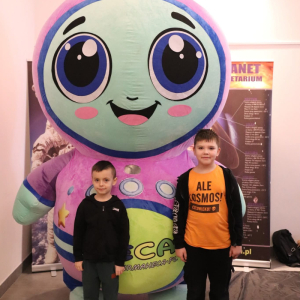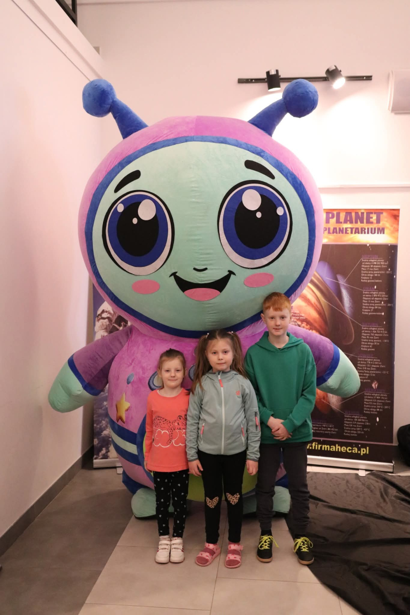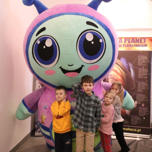 Nasza planeta jest całkiem nie z tej ziemi! W czwartek dzieci wyruszyły szlakiem gwiazd, a wszystko to za sprawą mobilnego planetarium, które zawitało do naszego Centrum. Rakieta wystartowała i obleciała cały układ słoneczny – podróżowaliśmy zaiste z prędkością światła! To żaden kłopot dla młodych odkrywców pokonywać miliardy kilometrów na godzinę! Nie ograniczyliśmy naszej podróży tylko do przestrzennej wędrówki, nie mniej fascynujący jest nasz organizm – on też już dla nas nie ma tajemnic! Pojawił się również ludzik z przestrzeni kosmicznej! Okazał się niegroźny i bardzo przyjacielski!