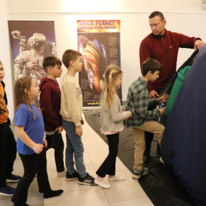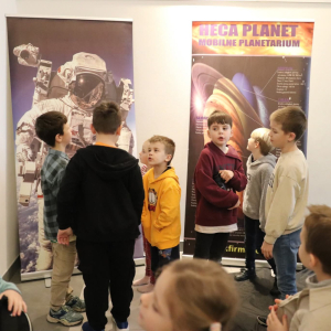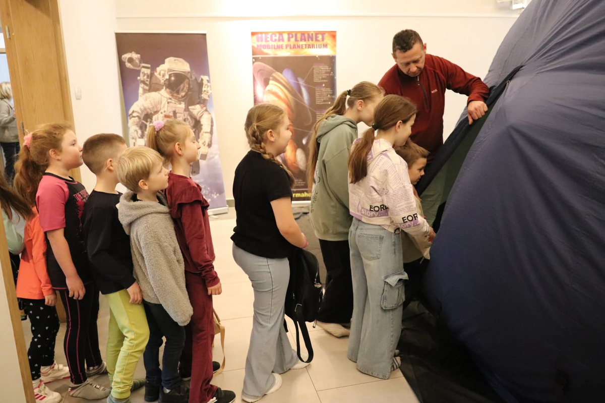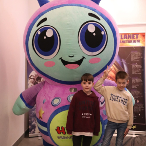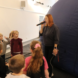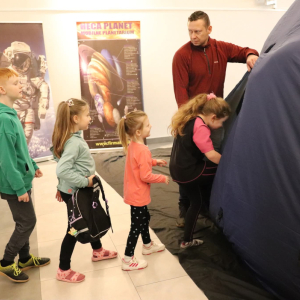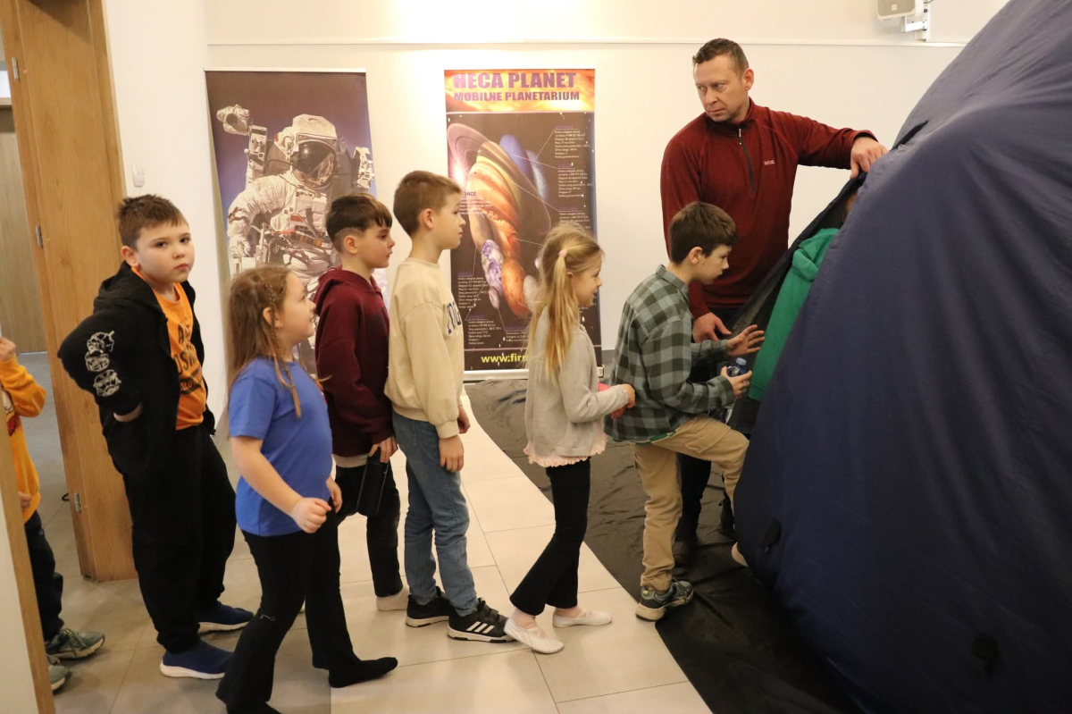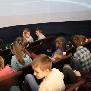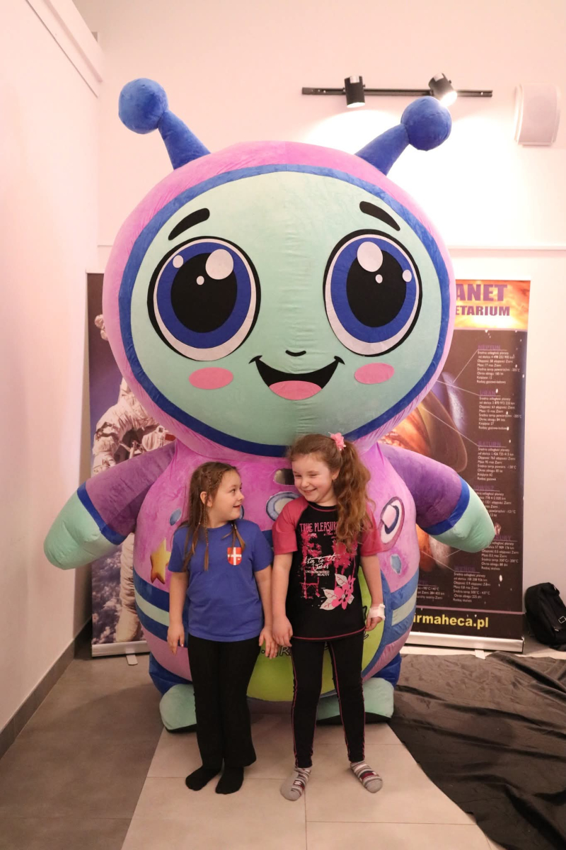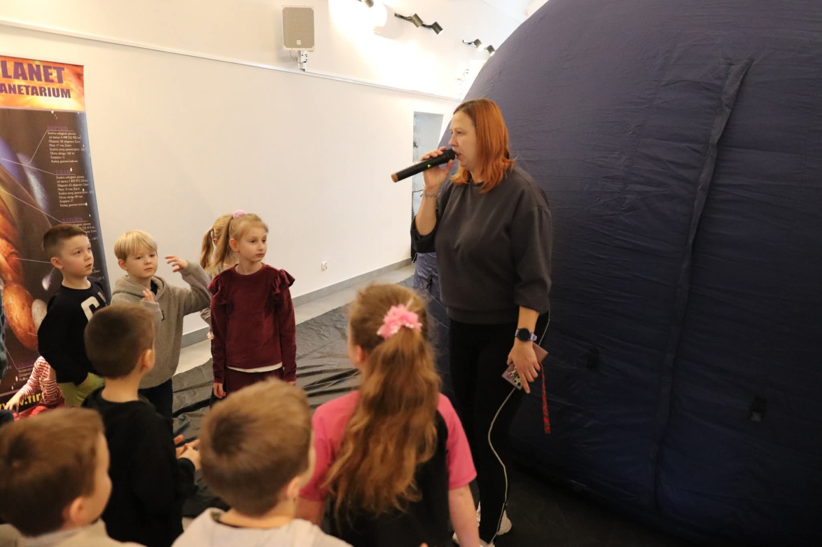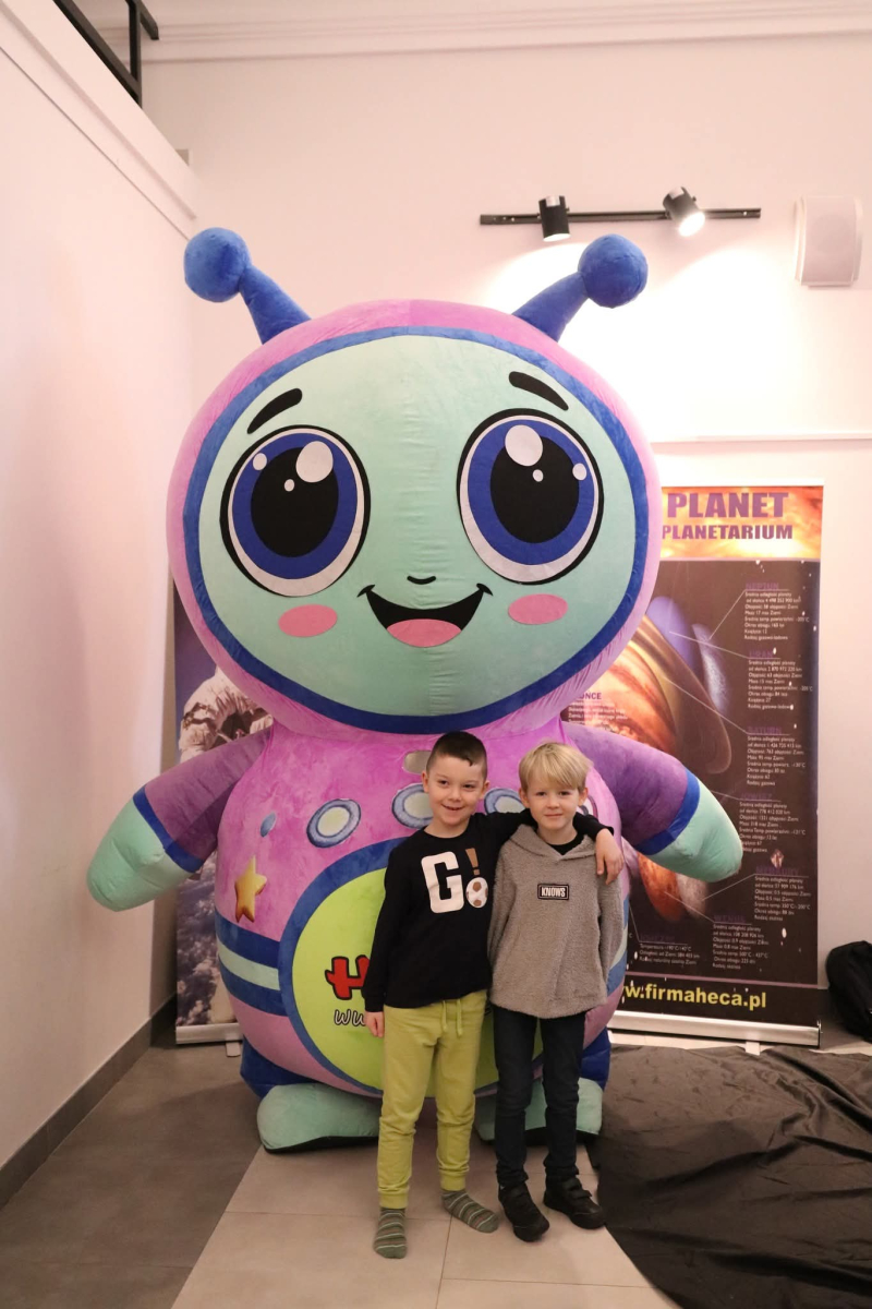 Nasza planeta jest całkiem nie z tej ziemi! W czwartek dzieci wyruszyły szlakiem gwiazd, a wszystko to za sprawą mobilnego planetarium, które zawitało do naszego Centrum. Rakieta wystartowała i obleciała cały układ słoneczny – podróżowaliśmy zaiste z prędkością światła! To żaden kłopot dla młodych odkrywców pokonywać miliardy kilometrów na godzinę! Nie ograniczyliśmy naszej podróży tylko do przestrzennej wędrówki, nie mniej fascynujący jest nasz organizm – on też już dla nas nie ma tajemnic! Pojawił się również ludzik z przestrzeni kosmicznej! Okazał się niegroźny i bardzo przyjacielski!